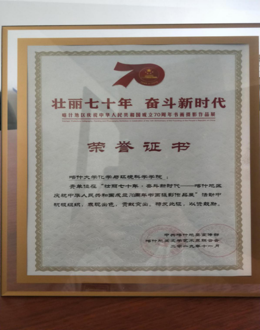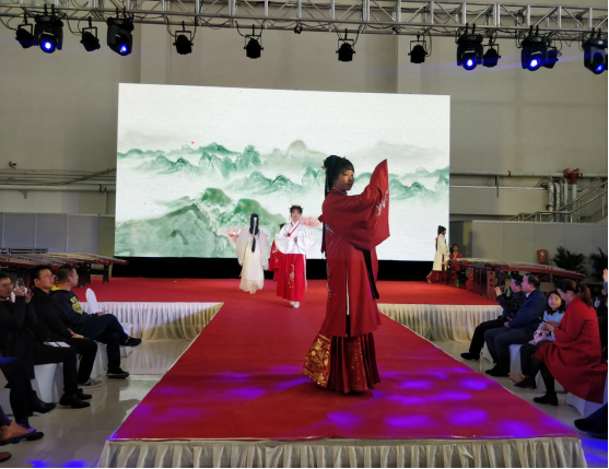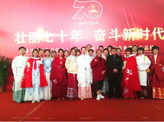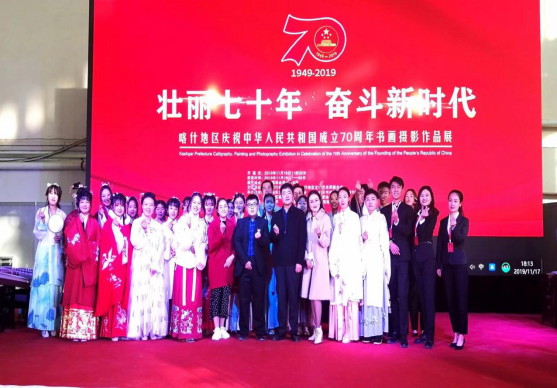 为热烈庆祝中华人民共和国成立70周年,回顾新中国70周年来的奋斗历程,展现新时代新青年的热血情怀,喀什地委宣传部、喀什地区文学艺术界联合会举办了“壮丽七十年 奋斗新时代”暨喀什地区庆祝中华人民共和国成立70周年书画摄影作品展活动,11月16日至17日我院思屿国学文化研习社应邀在喀什国际会展中心献上一场华丽的汉服展示,