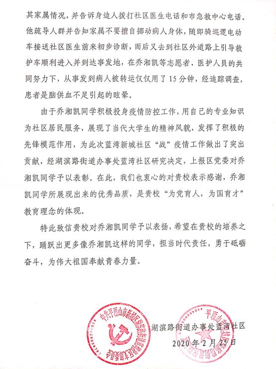 目前,在我们全体医护人员包括参与到疫情防控工作中的全体人员的共同努力下,全国的疫情得到了有效地控制,我们家所在的社区——湖滨路街道办事处蓝湾社区,在全体党员、志愿者、工作人员以及3000余户居民的共同努力下,实现了0确诊、0疑似、0事故。