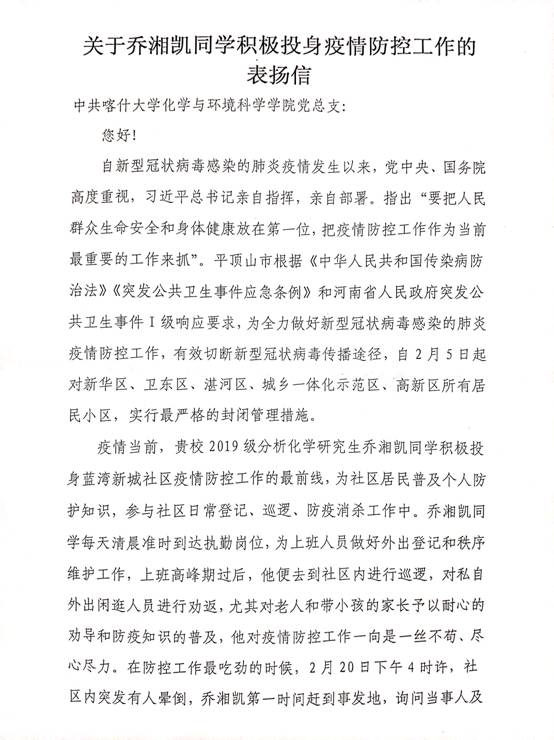 我所在的城市河南省平顶山市在启动一级应急响应之后,紧接着的2月5日,对城区以及村镇所有居民进行了严格的封闭管理,通知一出,我便告诉父母我要去社区报名参加疫情防控工作,我父母非常支持我,因为从过去几天里我和大家科普个人防护的效果来看,并没有引起足够重视。我身为一个学化学的学生,在这种紧急的时候我应该站出来去多做一些事情,引导更多的人做好防护。接下来我被分配到了社区疫情防控的第一组负责范围是整个社区,组长邓伯伯是一位退伍老兵,在他的指导下,我为社区居民办理出入卡、测量体温、引导上班人员做登记,同时,我也与社区物业工作人员一道对下班回来居民进行消毒。而后,我们去到社区内一遍遍的巡逻,劝阻大家不要在外聚集或停留,告知大家带好口罩,引导前来采购蔬菜的居民主动排队并间隔1.5米以上。